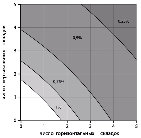 На рисунке 2.4 заливкой показаны области, в которых эта доля превышает 50 % для различных значений α. Например, приняв α = 0,75 % и сложив карту вдвое в одном направлении (одна складка) и вчетверо — в другом (три складки), мы найдем, что вероятность попасть в неудобное место превысит 50 %.