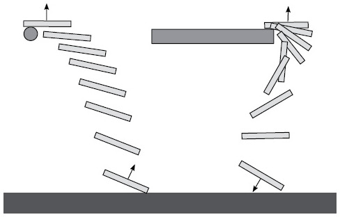 Я убежден, что намеренно ронять на пол настоящие бутерброды из хлеба и масла неправильно, поэтому воспользуемся математическим моделированием. Для решения задачи я взял один из доступных симуляторов физического мира, которые используют для создания онлайн-игр. Он легко позволил создать виртуальные стол и пол, а также два бутерброда. Один оказывался на краю стола, а второй «выскальзывал из пальцев», то есть соскальзывал с точечной опоры (рис. 3.1).