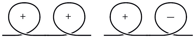 С этой неприятностью вполне можно бороться математическим способом: нужно либо исключить концы, что в случае наушников неинтересно, либо убрать петли. А это можно сделать с помощью операции сложения. Но не той, что мы изучали в школе, а той, что применяется к петлям на веревках и лентах. Как и числа, петли бывают разных знаков, причем для каждой «положительной» можно построить такую «отрицательную», что в сумме они дадут «ноль»: прямую веревку. Примеры таких петель показаны на рис. 1.1.