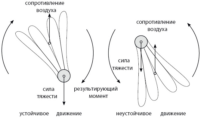 В обоих экспериментах мы видим, что легкое перо или лента быстро оказывались над тяжелой частью аппарата и стабилизировали падение. Это, видимо, и приводит к интуитивному мнению, что тяжелое масло и легкий хлеб тоже должны вести себя так. Представим себе воздушный шар: более плотная корзина всегда располагается под менее плотным шаром. Более того, опыт подсказывает, что если взяться двумя пальцами за геометрическую середину предмета с несимметрично распределенной массой, то он кувыркнется так, чтобы тяжелая часть оказалась внизу. Но ни одно из этих явлений не работает в случае падающего бутерброда.