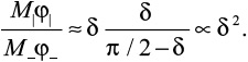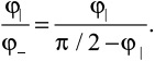 Теперь «включим» воздух обратно, оставив плотность масла бесконечно превышающей плотность хлеба. Имеем тонкую плотную пластину масла с невесомым, но сопротивляющимся воздуху «парашютом» хлеба. Пока плоскость бутерброда расположена горизонтально или близко к тому, на нее действует момент сил воздушного сопротивления, пропорциональный парусности — площади, с которой взаимодействует поток воздуха: M-∝l2. В вертикальном положении парусность уменьшится и, соответственно, момент будет другим: M|∝ld. Отношение этих моментов: M| /M-∝δ. Я использовал здесь знак пропорциональности, поскольку коэффициенты сопротивления для пластинки, расположенной поперек и вдоль потока, различаются, и мне они неизвестны. Но они и не нужны — уже видно, что влияние воздуха в вертикальном положении (а именно оно делает неравнозначным положение масла) слабее, чем в горизонтальном. Теперь вспомним, что бутерброд вращается, а значит, он подставляется потоку то торцом, то плоскостью. Мы можем ввести меру действия сил сопротивления. Если угловая скорость вращения несущественно изменяется за один период (а для воздуха это так), то имеет смысл в качестве меры взять изменение момента импульса, пропорциональное времени действия силы. В свою очередь, период действия пропорционален углу, «заметаемому» бутербродом в течение этого периода. В итоге меры действия моментов M| и M- будут пропорциональны M|φ| и M-φ-, а углы, которые заметают торец и плоскость, показаны на чертеже ниже. Мы могли бы в качестве меры использовать работу сил сопротивления и получили бы такое же соотношение. Отношение углов легко вычислить: