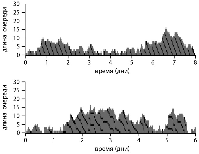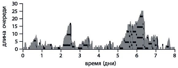Рис. 7.6. Динамика M/G/1-очереди, где время ожидания клиентов вдвое превосходит время занятости оператора. Горизонтальные темные полосы показывают периоды долгого ожидания очередного «трудного» клиента