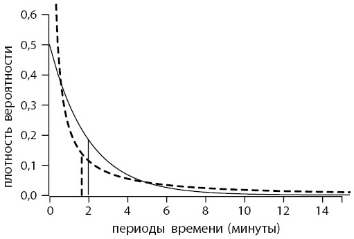 Очередь остается стабильной, поскольку λ < μ и клиенты в среднем обслуживаются быстрее, чем приходят новые. Оператор работает хорошо: большинство клиентов обслуживаются очень быстро; но обратите внимание на долю «трудных» клиентов, которые формируют достаточно толстый хвост распределения. Их мало, но каждый отнимает много времени, и все в очереди вынуждены их ждать. Для примера, приведенного на рисунке, среднее время ожидания оказалось равно 35 минутам, хотя среднее время занятости оператора прежнее (15 минут). Получается, что, не переставая работать, оператор в среднем филонит, пока мы страдаем в очереди от безделья!