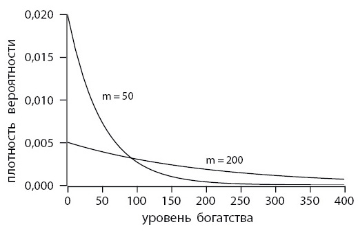 Рис. 9.6. Распределения достатка, соответствующие «горячему» (m = 200) и «холодному» (m = 50) рынкам