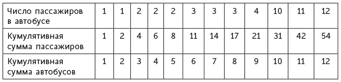 Рассмотрим эту ситуацию подробнее, построив кривую Лоренца (на этот раз настоящую) для числа пассажиров в автобусах, показанных на рис. 1.7.
