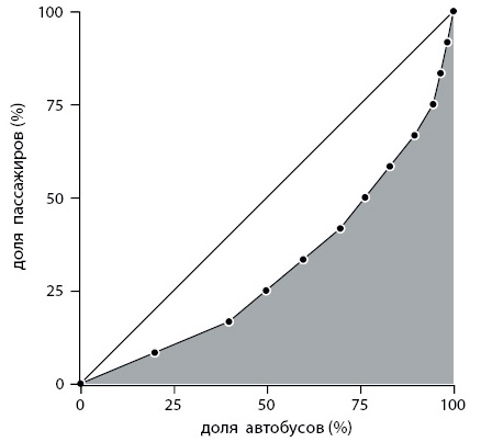 Рис. 1.8. Кривая Лоренца хорошо иллюстрирует несправедливость ситуации с автобусами: половина возит лишь четверть всего пассажиропотока, а на 25 % перегруженных машин приходится половина пассажиров