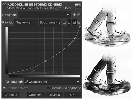 Рис. 1.9. Кривая Лоренца, примененная в качестве фильтра «Цветовая кривая» в растровом графическом редакторе, делает любую картину мрачнее