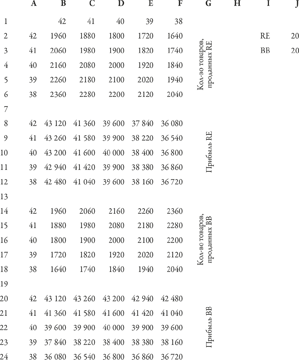Это позволяет рассчитать прибыль RE, если компания назначит на свой товар первую цену (42 доллара), а BB тоже назначит свою первую цену (42 доллара). Скопируйте эту формулу и вставьте ее во все остальные ячейки, для того чтобы получить полную таблицу прибылей компании RE.