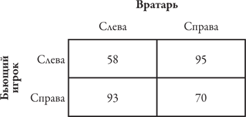 Мяч, по которому сделан сильный удар, долетает с 11-метровой отметки до ворот за две десятые секунды. У вратаря, который ждет момента удара, чтобы увидеть, куда направляется мяч, нет никаких шансов остановить его, если только мяч не был нацелен на самого вратаря. Футбольные ворота достаточно широкие; следовательно, вратарь должен заранее решить, следует ли ему делать прыжок, чтобы прикрыть одну из сторон, и если да, то в какую сторону необходимо двигаться – налево или направо. Игрок, выполняющий пенальти, тоже должен выбрать направление удара еще до того, как увидит, куда наклоняется вратарь. Разумеется, каждый из них сделает все возможное, чтобы скрыть свой выбор от другого. Следовательно, эту ситуацию лучше всего рассматривать как игру с параллельными ходами. В действительности крайне редко бывает так, что вратарь стоит в центре ворот, не прыгая налево или направо; игроки, выполняющие пенальти, тоже сравнительно редко бьют в центр ворот, и такое поведение можно объяснить теоретически. Поэтому мы упростим свои выкладки, ограничив выбор каждого игрока двумя вариантами. Поскольку игроки, выполняющие пенальти, бьют по мячу внутренней стороной ступни, естественное направление удара для игрока, бьющего правой ногой, – в правую сторону от вратаря, а для игрока, бьющего левой, – в левую сторону. Для простоты будем называть естественную сторону «справа». Следовательно, у каждого игрока есть два варианта выбора: «справа» и «слева». Когда вратарь выбирает вариант «справа», это означает естественную сторону выполнения удара игроком, бьющим пенальти.