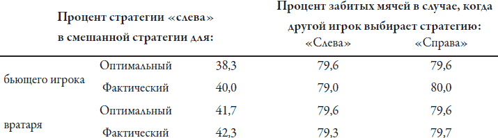 Обратите внимание на следующий факт: чем лучше пропорции смешивания стратегий игрока, выполняющего штрафной удар, тем меньше разница между показателями успешных ударов в случаях, когда вратарь выбирает стратегию «слева» и стратегию «справа». При выборе чистых стратегий эти показатели составляют 93 и 70 процентов; в случае смешивания стратегий по принципу 50:50–82,5 и 75,5 процента, а при смешивании стратегий в пропорции 40:60–80 и 79 процентов. Очевидно, что смешивание стратегий в оптимальной пропорции обеспечивает один и тот же процент успешных ударов независимо от того, какую стратегию выберет вратарь. Кроме того, это согласуется и с интуитивным предположением, что смешивание ходов – правильный подход, поскольку он не позволяет другому игроку извлекать для себя выгоду из любой системы или закономерности выбора.