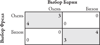 В качестве иллюстрации еще раз рассмотрим охотничью версию игры «семейный спор», о которой шла речь в . Вспомните наших отважных охотников Фреда и Барни, которые решают (каждый в своей пещере), на какого зверя им охотиться – на оленя или на бизона. Удачная охота требует совместных усилий обоих охотников, поэтому, если они выберут противоположные варианты, никто из них не добудет мяса. И Фред, и Барни заинтересованы в том, чтобы предотвратить такой итог. Однако помимо двух вариантов благополучного исхода (при условии, что они охотятся на одном участке) нужно учесть, что Фред отдает предпочтение мясу оленя и оценивает результат совместной охоты на этого зверя как четыре вместо трех единиц мяса, тогда как у Барни противоположные предпочтения. Следовательно, таблица их выигрышей выглядит так: