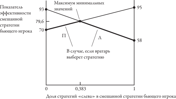 Вратарю необходимо удерживать показатель эффективности стратегии бьющего игрока на как можно более низком уровне. Следовательно, если бы структура смешанной стратегии бьющего игрока была известна вратарю, он выбрал бы стратегию «слева» или «справа», отображенную одним из тех сегментов двух линий, которые расположены ниже точки пересечения. Эти сегменты, выделенные жирным и образующие перевернутую букву V, отображают минимальный показатель эффективности стратегии игрока, выполняющего штрафной удар, если вратарь использует выбор бьющего игрока с наибольшей выгодой для себя. Бьющему игроку необходимо выбрать из этих минимальных значений максимальный показатель эффективности своей смешанной стратегии. Это значение соответствует вершине перевернутой буквы V, то есть точке пересечения двух линий. Внимательно изучив график, получим те же координаты этой точки, которые дает алгебраическое решение: x = 0,383, а показатель эффективности стратегии – 79,6 процента.