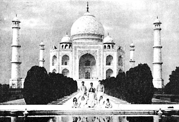 Рис. 36. Я со спутниками позирую перед «мечтой в мраморе», Тадж-Махалом в Агре