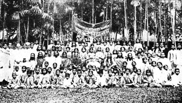 Рис. 50. Группа учеников и преподавателей школы в Ранчи позирует с достопочтенным махараджей Касимбазара (в центре, в белом). В 1918 году он отдал свой дворец Касимбазар и двадцать пять акров земли в Ранчи в качестве постоянного места для моей школы йоги для мальчиков