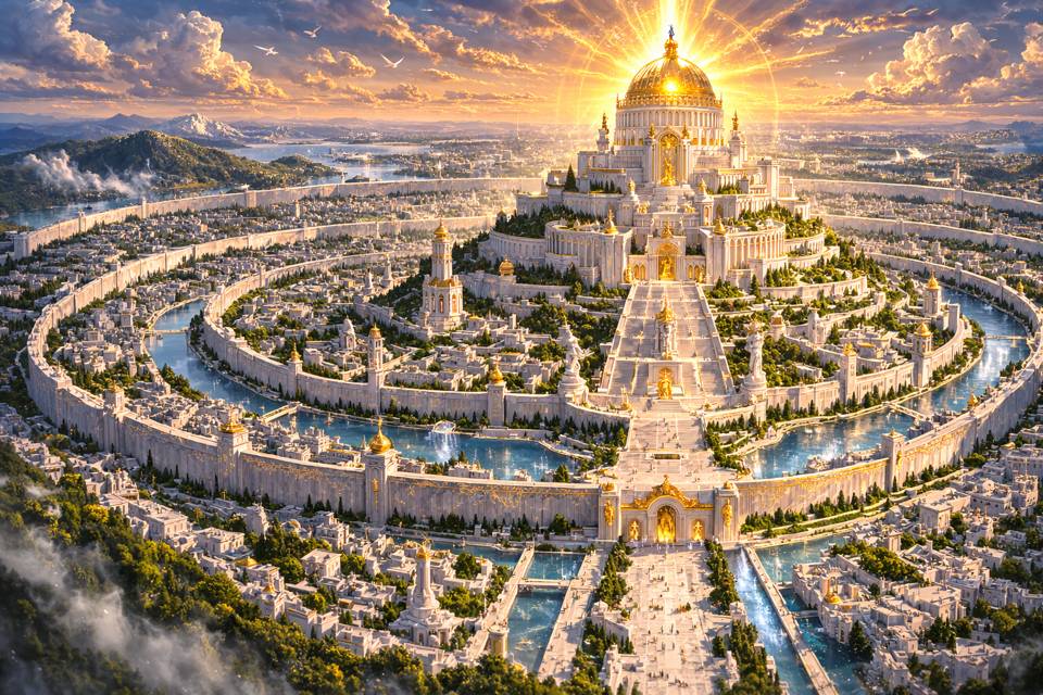 Святой Город раскинулся среди зелёных холмов и был опоясан тройным кольцом стен из белого камня, пронизанного золотыми прожилками. Каждое кольцо поднималось выше предыдущего, и город словно восходил ступенями к самому небу. Между стенами тянулись широкие улицы, утопающие в зелени — деревья с серебристой листвой росли вдоль каналов, по которым текла кристально чистая вода.