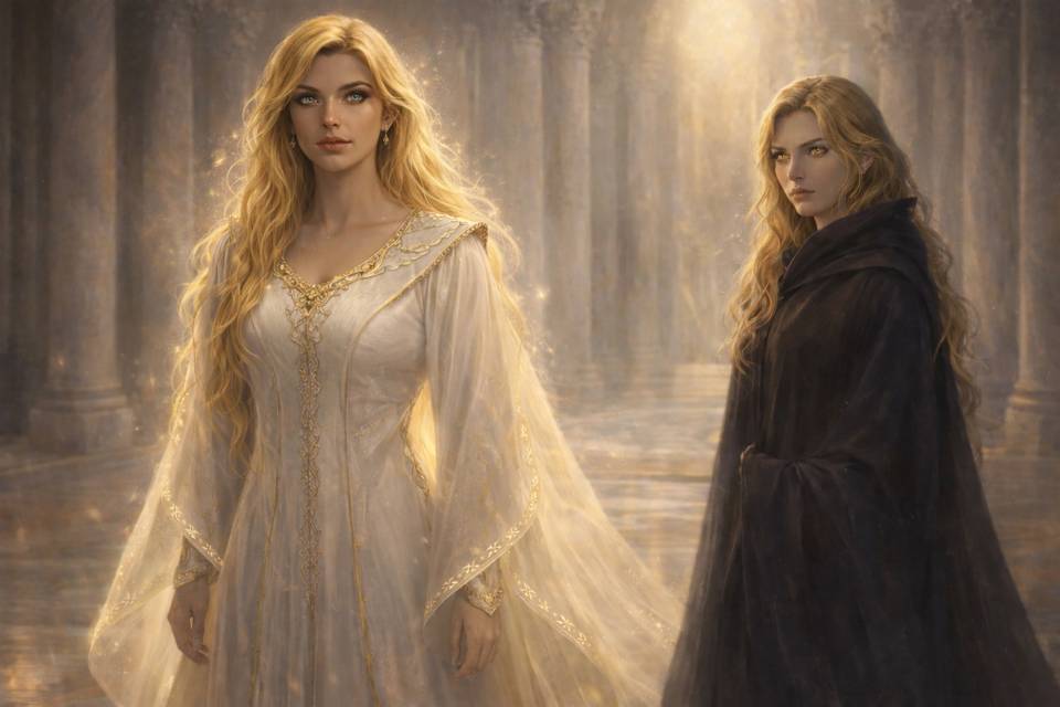 Первая была одета в свободное белоснежное одеяние, ниспадающее до пола мягкими складками. Широкие рукава, расшитые тончайшими золотыми нитями, почти скрывали кисти рук. На плечах покоилась полупрозрачная накидка, которая тянулась далеко позади неё, словно шлейф. Вдоль воротника и по краям одежды шла узкая кайма из светящихся рун — они мерцали так слабо, что казались просто частью узора.У женщины были светлые волосы, словно сотканные из света, и пронзительные голубые глаза. От неё исходила спокойная аура, которая казалась такой же безбрежной, как океан.