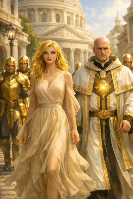 Миранда словно плыла по воздуху. Воздушное бежевое платье струилось по её фигуре, колыхаясь на ветру. Рядом с ней шагал важный на вид лысый мужчина в знакомых мне бело-золотых одеждах. На его шее висел довольно массивный золотой амулет, испускающий слабое сияние.