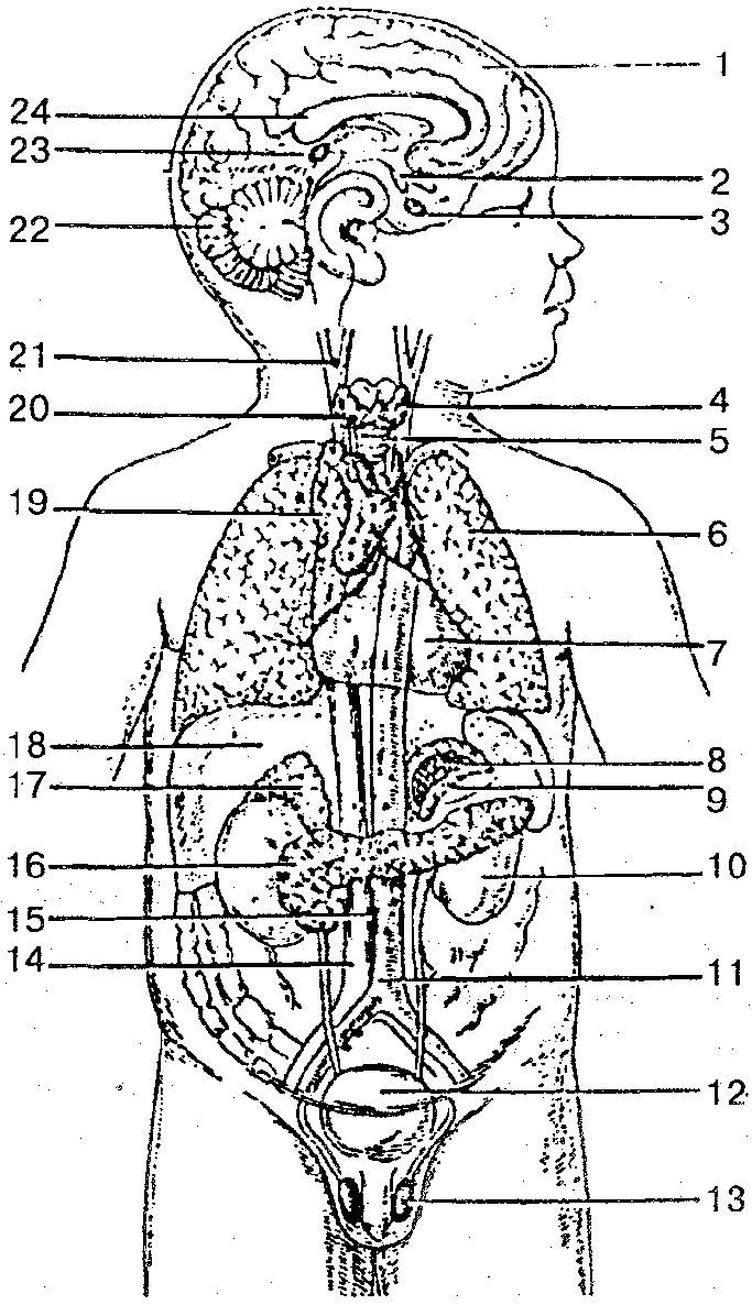 1 — полушарие большого мозга; 2 — ядра гипоталамуса; 3 — гипофиз; 4 — щитовидная железа; 5 — трахея; 6— легкое; 7— перикард; 8— мозговое вещество надпочечника; 9 — корковое вещество (кора) надпочечника; 10 — почка; 11 — аорта; 12— мочевой пузырь; 13— яичко; 14— нижняя полая вена; 15— аортальный параганглий; 16— поджелудочная железа; 17— надпочечник; 18 — печень; 19 — вилочковая железа (тимус); 20 — паращитовидная железа; 21— сонный гломус; 22— мозжечок; 23— шишковидное тело (эпифиз); 24—мозолистое тело