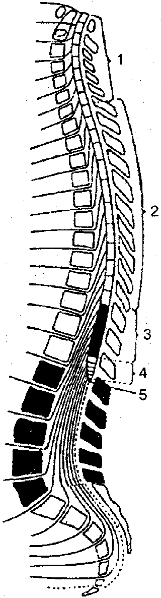 1 — шейные сегменты (1—8), шейная часть; 2 — грудные сегменты (1—12), грудная часть; 3— поясничные сегменты (1—5), поясничная часть; 4— крестцовые сегменты (1—5), крестцовая часть; 5— копчиковые сегменты (1—3), копчиковая часть