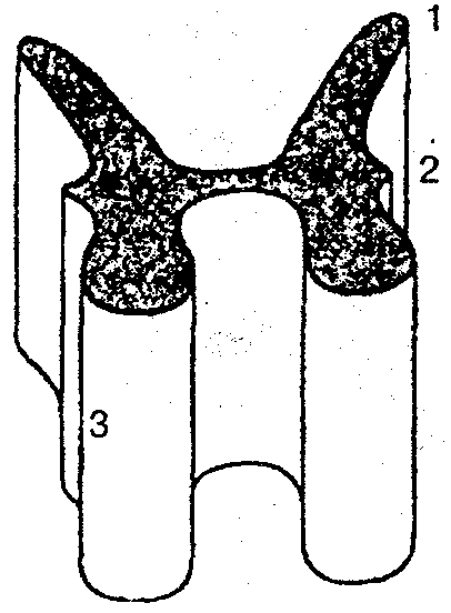 1 — мягкая оболочка спинного мозга; 2 — подпаутинное пространство; 3 — паутинная оболочка спинного мозга; 4 — твердая оболочка спинного мозга; 5 — эпидуральное пространство; 6 — зубчатая связка; 7 — промежуточная шейная перегородка