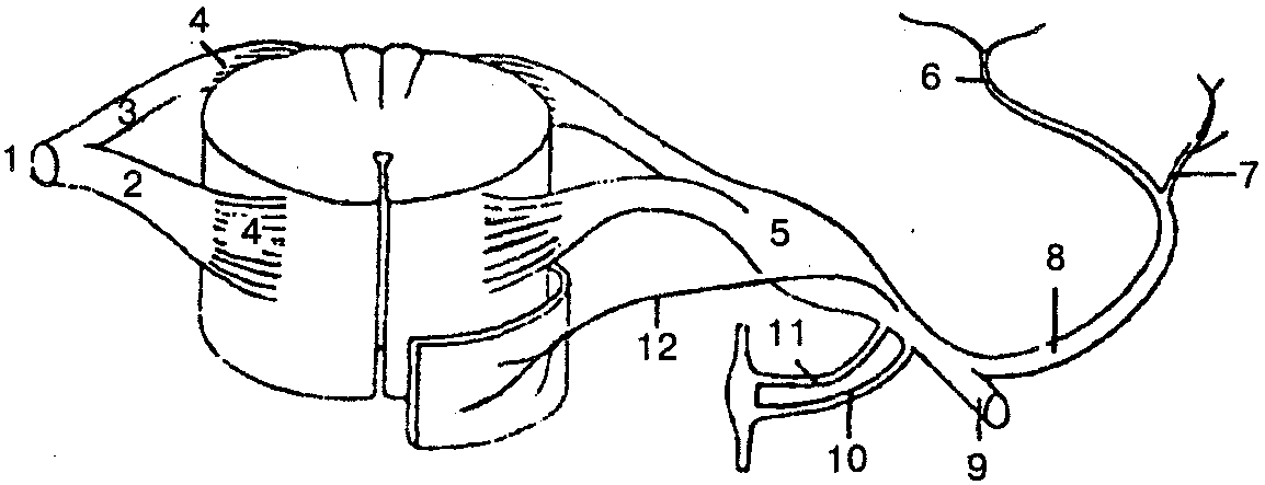 1 — ствол спинномозгового нерва; 2 — передний (двигательный) корешок; 3— задний (чувствительный) корешок; 4— корешковые нити; 5— спинномозговой (чувствительный) узел; 6— медиальная часть задней ветви; 7— латеральная часть задней ветви; 8 — задняя ветвь; 9 — передняя ветвь; 10 — белая ветвь; 11 — серая ветвь; 12 — менингеальная ветвь