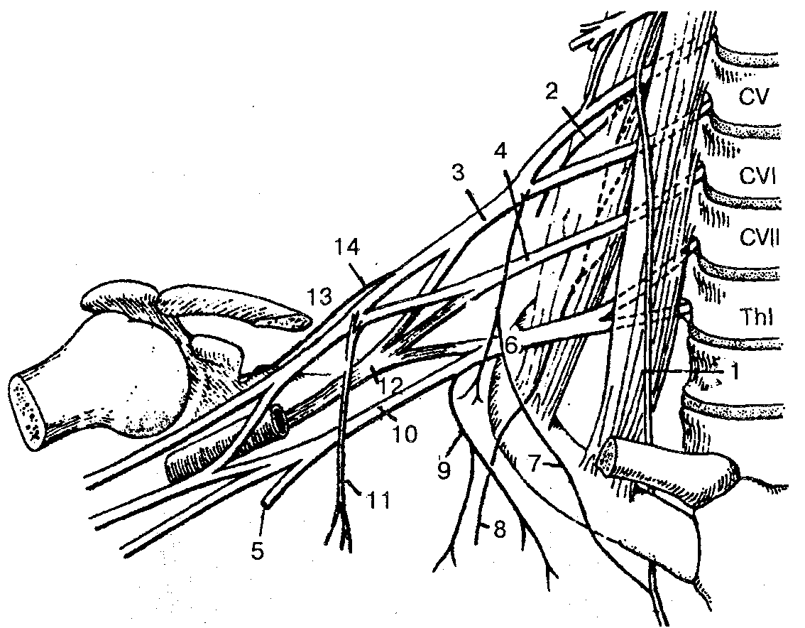 1 — диафрагмальный нерв; 2 — дорсальный нерв лопатки; 3 — верхний ствол плечевого сплетения; 4 — средний ствол плечевого сплетения; 5 — подключичный ствол; 6 — нижний ствол, плечевого сплетения; 7 — добавочные диафрагмальные нервы; 8 — длинный грудной нерв; 9 — медиальный грудной нерв; 10 — латеральный грудной нерв; 11 — медиальный пучок; 12 — задний пучок; 13 — латеральный пучок; 14 — надлопаточный нерв