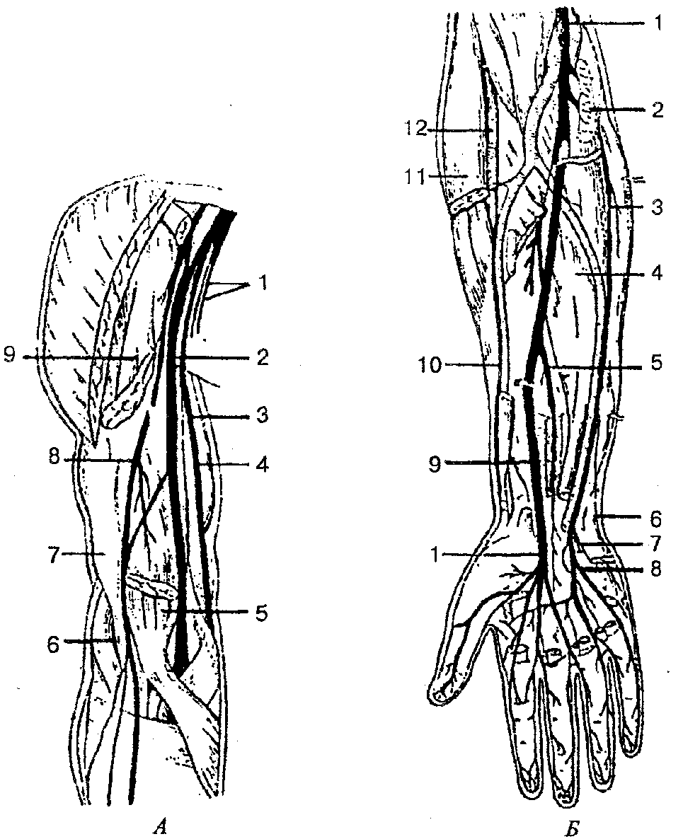 А — нервы плеча: 1 — медиальный кожный нерв плеча и медиальный кожный нерв предплечья; 2 — срединный нерв; 3 — плечевая артерия; 4 — локтевой нерв; 5 — двуглавая мышца плеча (дистальный конец); 6— лучевой нерв; 7— плечевая мышца; 8— мышечно-кожный нерв; 9— двуглавая мышца плеча (проксимальный конец); Б — нервы предплечья и кисти: 1 — срединный нерв; 2 — круглый пронатор (пересечен); 3 — локтевой нерв; 4 — глубокий сгибатель пальцев; 5— передний межкостный нерв; 6— тыльная ветвь локтевого нерва; 7— глубокая ветвь локтевого нерва; 8 — поверхностная ветвь локтевого нерва; 9 — квадратный пронатор (пересечен); 10 — поверхностная ветвь лучевого нерва; //— плечелучевая мышца (пересечена); 12 — лучевой нерв