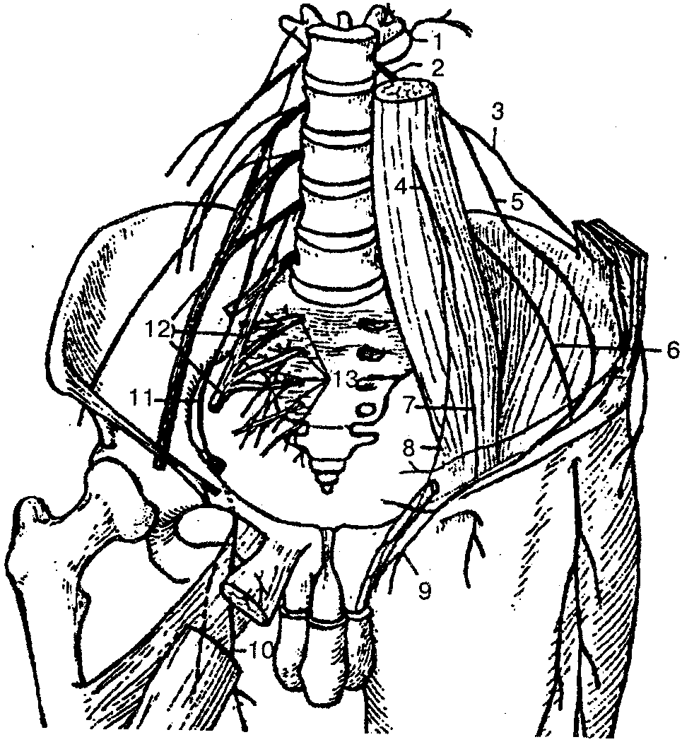 1-задние ветви поясничных нервов; 2- передние ветви поясничных нервов; 3- подвздошно-подчревный нерв; 4- бедренно-половой нерв; 5-подвздошно-паховый нерв; 6 - латеральный кожный нерв бедра; 7- бедренная ветвь; 8- половая ветвь; 9 - передние мошоночные нервы; 10 -передняя ветвь запирательного нерва; 11 - запирательный нерв; 12 — пояснично-крестцовое сплетение; 13 - передние ветви крестцового сплетения