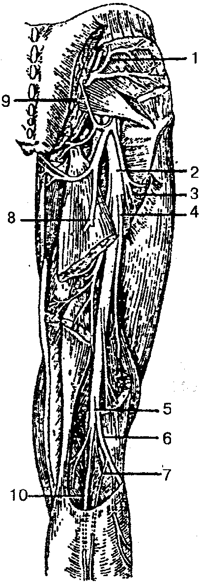 1 — верхний ягодичный нерв; 2— седалищный нерв; 3,4— мышечные ветви седалищного нерва; 5 — большебердовый нерв; 6 — общий малоберцовый нерв; 7— латеральный кожный нерв икры; 8- задний кожный нерв бедра; 9 — нижний ягодичный нерв; 10— медиальный тыльный кожный нерв