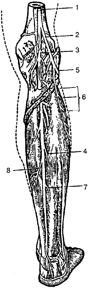 1 — седалищный нерв; 2 — общий малоберцовый нерв; 3— болыпеберцовый нерв; 4, 7,8— мышечные ветви болыиеберцового нерва; 5 — латеральный кожный нерв икры; 6 — мышечные ветви малоберцового нерва