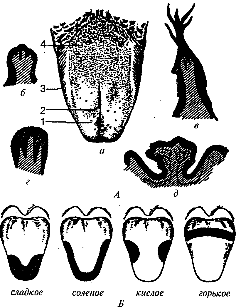 А — сосочки языка; а — общий вид; б — грибовидный сосочек; в — нитевидный сосочек; г — листовидный сосочек; д — желобовидный сосочек (/ — грибовидные сосочки; 2— нитевидные сосочки; 3 — листовидные сосочки; 4— желобовидные сосочки); Б — вкусовые поля языка