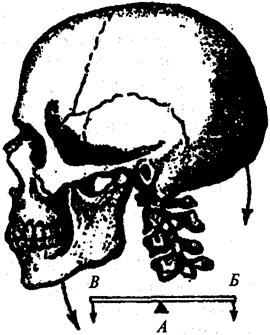 Рычаг первого рода двуплечий, если точка опоры находится посередине между точками приложения сил, например соединение позвоночника с черепом (рис. 55).