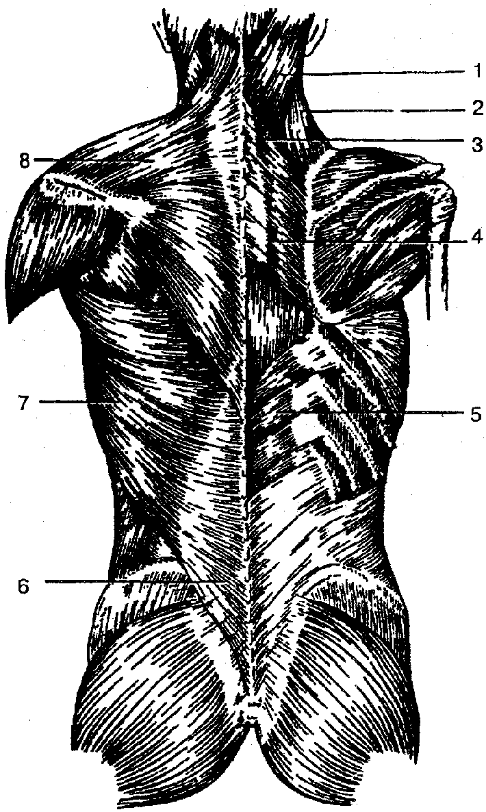 1 — ременная мышца головы; 2 — мышца, поднимающая лопатку; J — малая ромбовидная мышца; 4 — большая ромбовидная мышца; 5 — нижняя задняя зубчатая мышца; 6— поясничнр-фудная фасция; 7 - широчайшая мышца спины; 8 —трапециевидная мышца