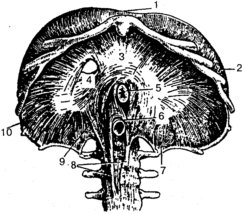 1 — грудчнная часть диафрагмы; 2, 10— реберная часть диафрагмы; 3 — сухожильный центр;4 — отверстие для нижней полой вены; 5 — отверстие для пищевода; 6— отверстие для аорты; 7, 8, 9 — ножки поясничной части диафрагмы