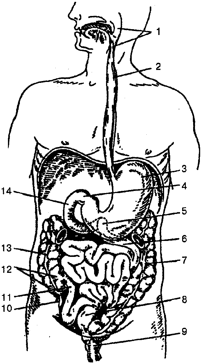 1 — глотка; 2 — пищевод; 3 — желудок; 4 — место перехода желудка в двенадцатиперстную кишку; 5— место перехода двенадцатиперстной кишки в тощую; 6— тощая кишка; 7— нисходящая ободочная кишка; 8— сигмовидная ободочная кишка; 9 — прямая кишка; 10 — червеобразный отросток (аппендикс); // — подвздошная кишка; 12 — слепая кишка; 13 — восходящая ободочная кишка; 14 — двенадцатиперстная кишка