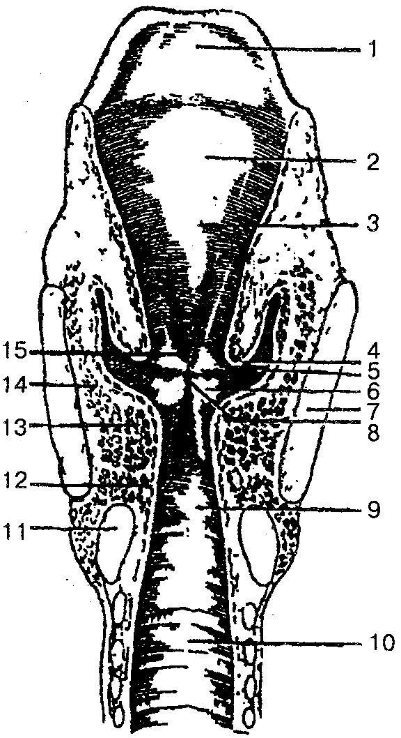 1 — надгортанник; 2 — надгортанный бугорок; 3 — преддверие гортани; 4 — складка преддверия; 5 — желудочек гортани; 6 — голосовая складка; 7— щитовидный хрящ; 8 — голосовая щель; 9 — подголо-совая полость; 10 — полость трахеи; 11 — перстневидный хрящ; 12 — латеральная перстнечерпаловидная мышца; 13 — голосовая мышца; 14— щиточерпаловидная мышца; 15— щель преддверия