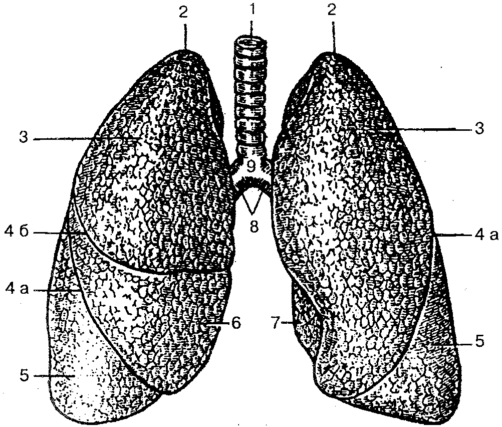 1 — трахея; 2 — верхушка легкого; 3 — верхняя доля; 4 а — косая щель; 46— горизонтальная щель; 5— нижняя доля; 6— средняя доля; 7— сердечная вырезка левого легкого; 8 — главные бронхи; 9 — бифуркация трахеи