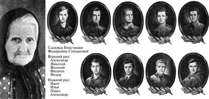 Началась Великая Отечественная, и все братья Степановы, бывшие на тот момент в живых, ушли на фронт. Матери оставалось только ожидать их возвращения. Но похоронки приходили в дом Степановой одна за другой. В 1941-м пришло извещение о том, что пропал без вести под Москвой Павел (родился в 1919 г.), в 1943-м — о том, что погибли в бою Василий (родился в 1908 г.), Илья (родился в 1917 г.) и Александр-младший (родился в 1923 г.; в бою, будучи окружен противником, гвардии старший лейтенант Александр Степанов взорвал себя и врагов последней гранатой, посмертно стал Героем Советского Союза). Живым мать увидела только Николая (родился в 1903 г.), вернувшегося с войны инвалидом. И только спустя годы Епистиния Федоровна узнала о судьбах других своих детей, которые считались пропавшими без вести. Их тоже поглотила война: Филипп (родился в 1910 г.) попал в плен в мае 1942-го и умер в лагере для военнопленных три года спустя, а Иван (родился в 1915 г.) был расстрелян немцами в Белоруссии в 1942-м.