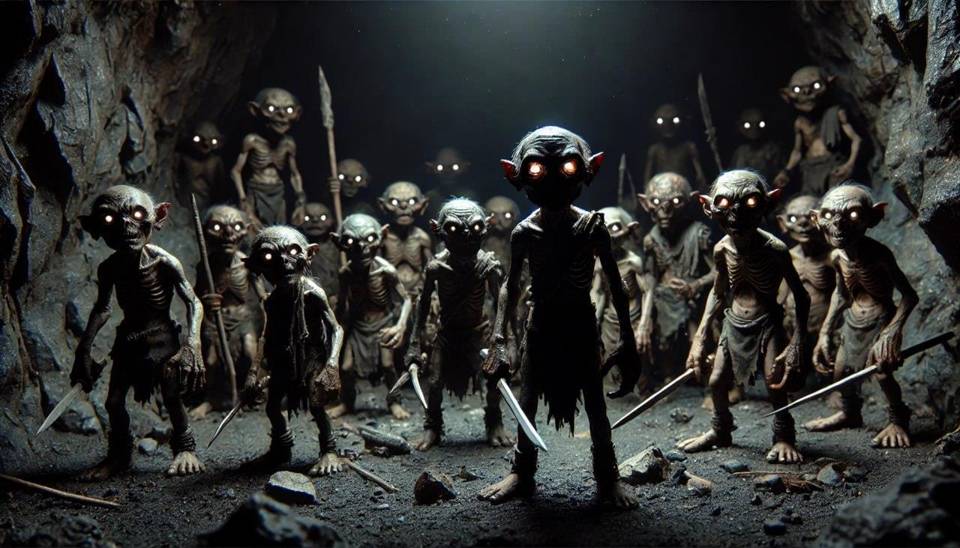 Я стоял в центре какого-то жилища, на ворохе гнилых тряпок, а меня окружало, щурясь от света, с дюжину невысоких прямоходящих тварей, с когтистыми лапами, клыками и горящими глазами. Некоторые держали то ли ножи, то ли какие-то короткие копья.