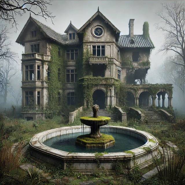 Штукатурка здания немного осыпалась. Плоская крыша заросла кустарником. Правое крыло осело, а на башне покосился шпиль. На стене, от самой крыши и до фундамента, трещина в виде молнии.