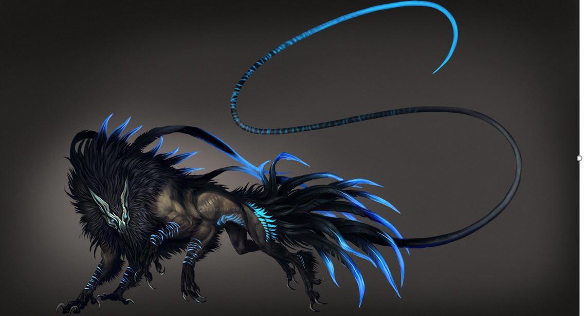 Стройная, длинная, чем-то очень отдалённо напоминающая помесь жеребца, мощной собаки и какой-то птицы, только ещё и с пушистой гривой, шестью лапами и синими перьями, вдоль позвоночника и на задних конечностях. Длинной существо было метра два с половиной, а высотой примерно полтора метра. Позади тянулся длиннющий тонкий хвост, с синим свечением.