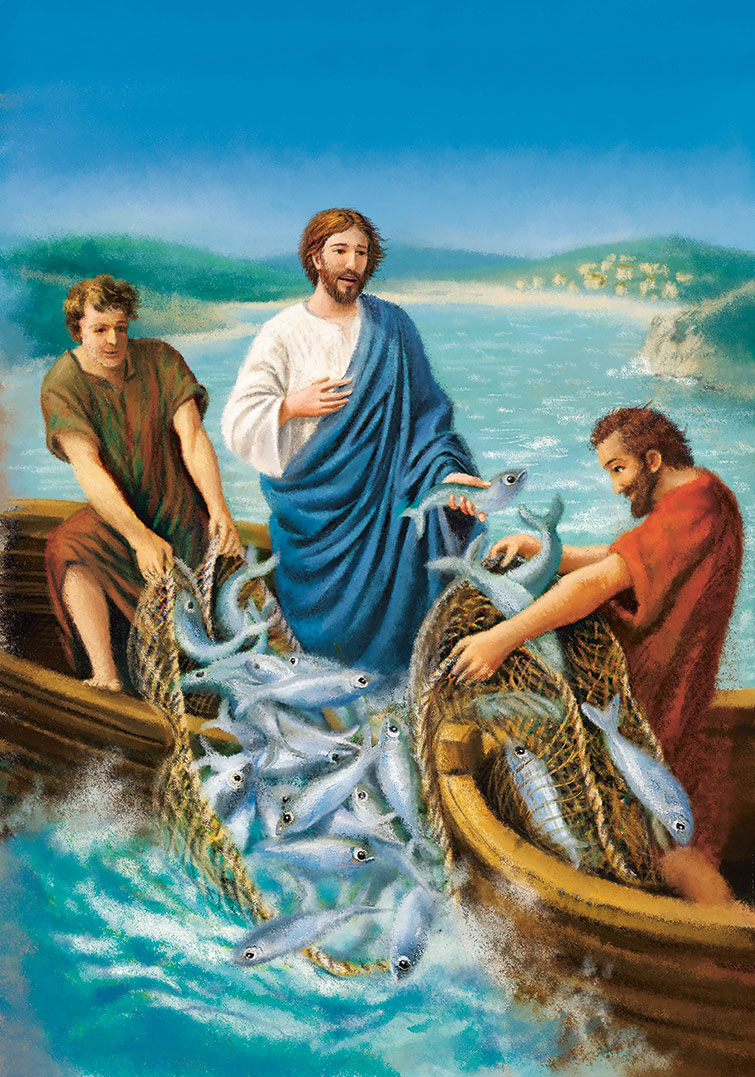 Исполняя волю Христа, ученики выгребли на середину озера и забросили сеть. Когда же они начали вытаскивать её, то почувствовали огромную тяжесть. Они увидели, что сеть полна крупной рыбы. Вдвоем они не смогли её вытащить и вынуждены были звать на помощь братьев Зеведеевых.