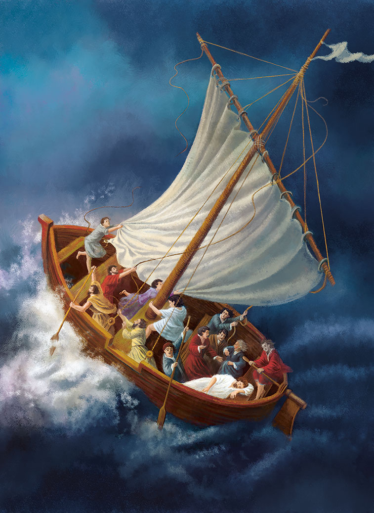 Дул свежий ветер. Вскоре небо начали заволакивать тёмные тучи. Волны раскачивали лодку. А Христос прилёг на корме и заснул.