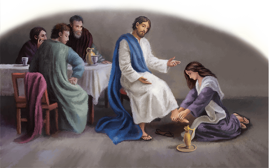 Мария вошла в комнату, где ужинал Иисус с учениками, и тихо приблизилась к Нему. Со слезами, отливая на ладонь драгоценное масло, она помазала им голову Иисуса, а затем и Его ноги. Дом наполнился благоуханным ароматом.