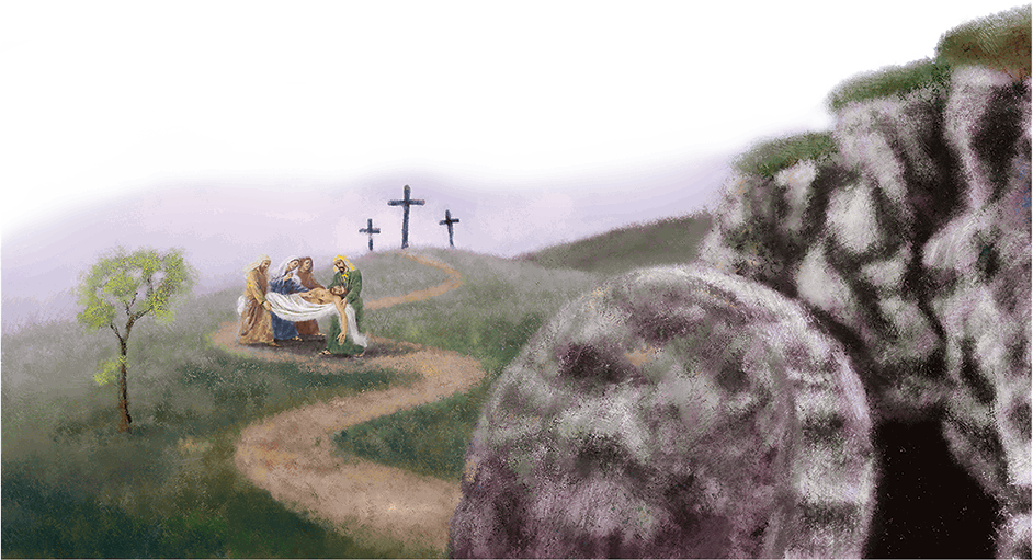 Они принесли тело Христа на участок земли, принадлежавший Иосифу Аримафейскому. Этот участок с садом находился недалеко от Голгофы. Среди деревьев там высилась скала с пещерой, в которой Иосиф сам хотел быть похороненным. Но теперь он отдал этот пещерный гроб для Иисуса.