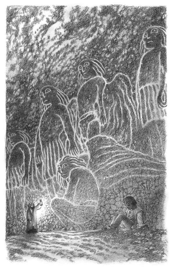 В слабом свете единственного фонаря казалось, что картины на стенах комнаты движутся, существа на них обретают формы – явно человеческие, только с огромными ниспадающими крыльями; они вытягиваются, приседают, не в силах сдвинуться с места в бесконечной тоске.