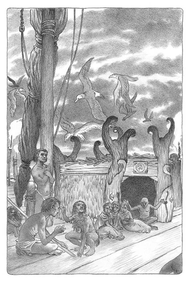 Ястреб сидел рядом с вождем и тремя его женами возле храма. В дверном проеме между резными изображениями китов устроился певец, чей высокий голос не умолкал в течение всей ночи. Неутомимый, он пел, отбивая руками ритм по бревнам плота, просто ради собственного удовольствия.