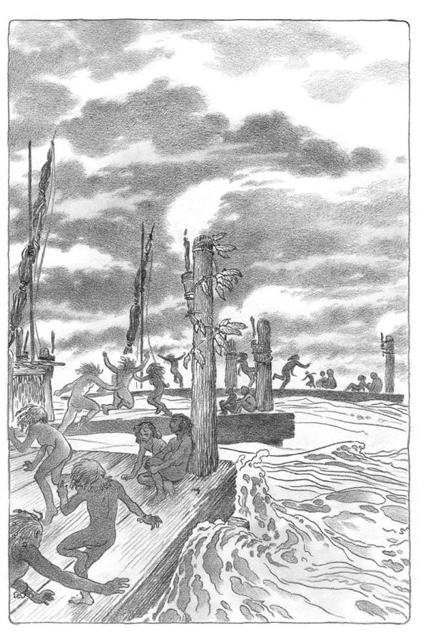 Всю ночь, самую короткую ночь в году, горели факелы на плотах, образовывавших огромный круг под усыпанным звездами небом; кольцо огней отражалось в движущейся воде. Жители плотов танцевали без музыкального сопровождения, не звучали ни барабаны, ни флейты, лишь босые ноги отбивали ритм на огромных бревнах да раздавались высокие голоса певцов, словно жалобные крики чаек в безбрежном морском просторе, что был для них родным домом. Луна не появлялась, и тела танцоров мелькали, словно тени, в неярком свете звезд и факелов. То и дело кто-то нырял в волны, как рыбка, и вскоре появлялся на соседнем плоту; ныряльщики описывали в воздухе изящные высокие дуги, соревнуясь друг с другом и стремясь побывать на всех плотах по очереди, потанцевать на каждом из них и успеть до рассвета замкнуть круг.