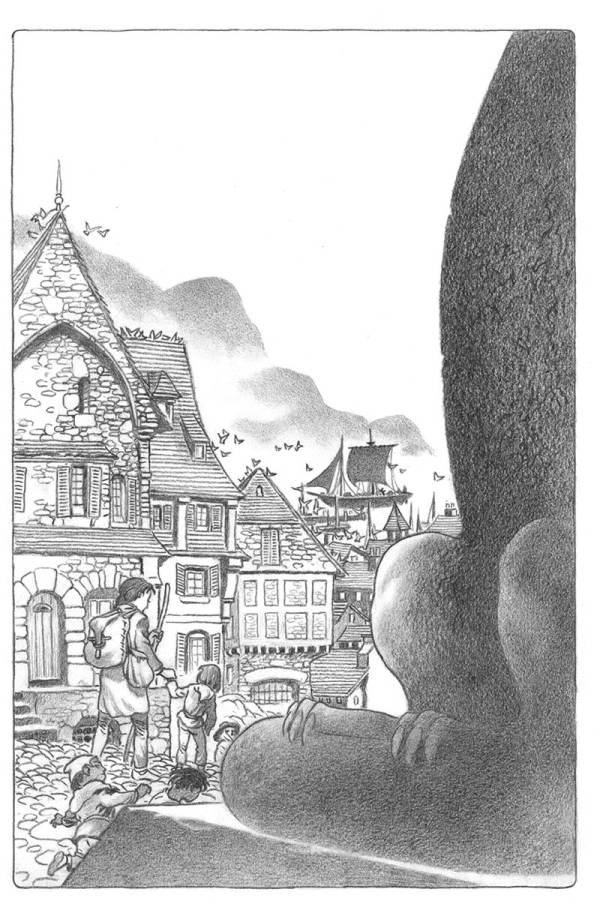 Ей хотелось спросить, как попасть на южную дорогу, что идет вдоль побережья через холмы в Вальмут. Но она не решилась снова привлекать к себе внимание стражника, чтобы тот не прогнал ее, как обычную бродяжку, ведьму или кого-то еще, кому он вместе с каменными драконами обязан был преградить путь в этот город. Они быстро прошли мимо драконов и устремились дальше – Терру даже немножко приподняла голову, чтобы на ходу взглянуть на великолепные резные изваяния, и поплелась следом за Тенар, спотыкаясь о каждый камень, все больше и больше удивляясь, смущаясь и постепенно сникая. Тенар казалось, что в этом огромном городе можно найти все, что угодно, все на свете. Высокие каменные дома, различные повозки, ломовые телеги, тележки, рогатый скот, ослики, рынки, магазины, толпы людей, люди, люди, люди – чем дальше они шли, тем больше им встречалось людей. Терру жалась к руке Тенар, льнула к ней, пряча лицо под свисавшими волосами. Тенар и сама старалась держаться поближе к Терру. Она понимала, что здесь им не место, так что они сразу пошли на юг, рассчитывая двигаться до наступления темноты – а теперь темнело рано – и потом заночевать где-нибудь в лесу. Тенар высмотрела какую-то толстуху в немыслимо пышном белом фартуке, закрывавшую ставни своего магазинчика, и решила спросить у нее, как выйти из города на южную дорогу. Суровое красное лицо женщины казалось довольно располагающим, однако, пока Тенар набиралась храбрости, Терру вдруг буквально впилась ногтями в ее руку и попыталась спрятаться у нее за спиной. Подняв глаза, Тенар увидела, что по улице прямо к ним идет тот самый человек в кожаной шапке. Он тоже сразу увидел ее. И остановился.