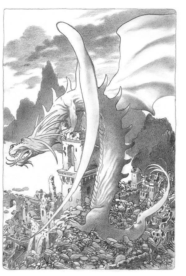 Жуткий звук, похожий на шум далекого горного обвала, вырвался из глотки дракона. Пламя заплясало в его пасти и на конце похожего на трезубец языка. Он распрямился во весь рост, громоздясь над руинами городских башен.